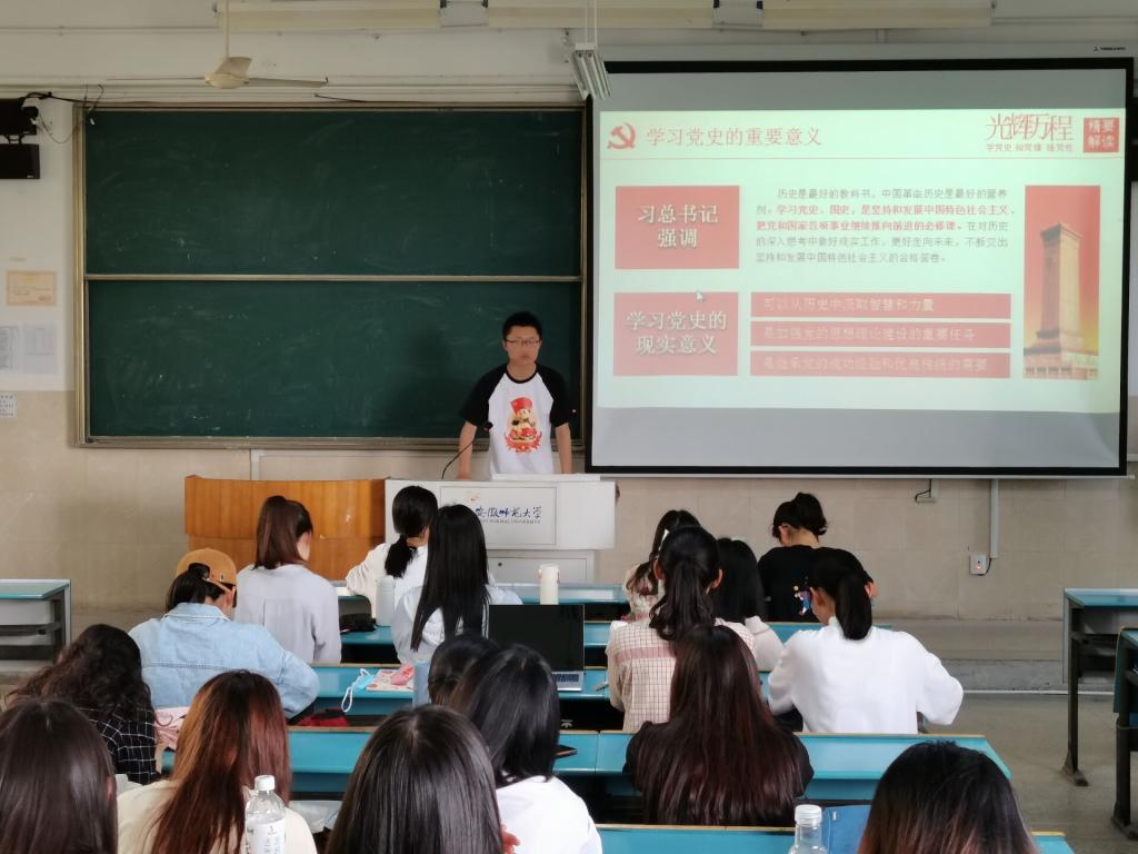 团支书梅立浩介绍此次学党史活动的主要流程,让大家深刻体会学习改革开放历史的重大意义。她播放改革开放纪录片,讲述了邓小平同志在十一届三中全会后实施的经济建设的重大举措,让同学们重温改革开放历史。副团支书李良辉从学习党史的重要意义、党史的时间脉络、改革开放和现代化建设的新阶段三个方面带领大家再次全面学习党史。同学们始终认真听讲,学习热情持续高涨。
