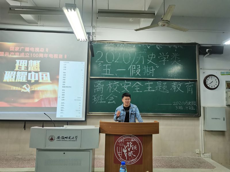 本网讯(20历史 饶少旗)为帮助同学们牢固树立安全意识,让同学们度过一个平安、欢乐的五一假期,2020级历史学类4个班于4月29日晚7点30在行知楼2050101、2050102教室召开了五一假期安全教育主题班会,班会由辅导员郭忠尧主持。
