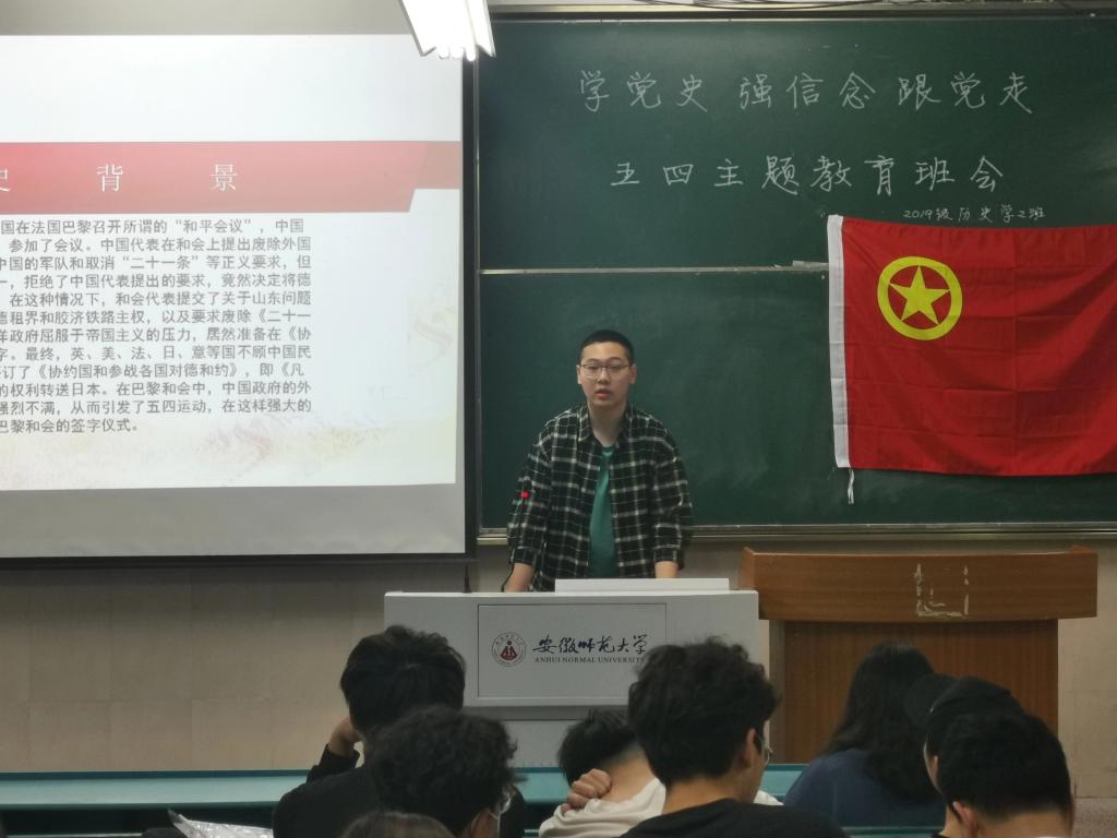 本网讯(19历史 叶宁宁)为传承五四精神,凝聚青春力量,引导班级广大同学坚定理想信念,团结引领广大青年以奋发向上的精神状态迎接和庆祝建党百年。5月8日下午,2019级历史学2班在2040102教室召开了一次“学党史、强信念、跟党走”五四运动主题班会,会议由团支书李裴阳主持,班级全体团员参与。