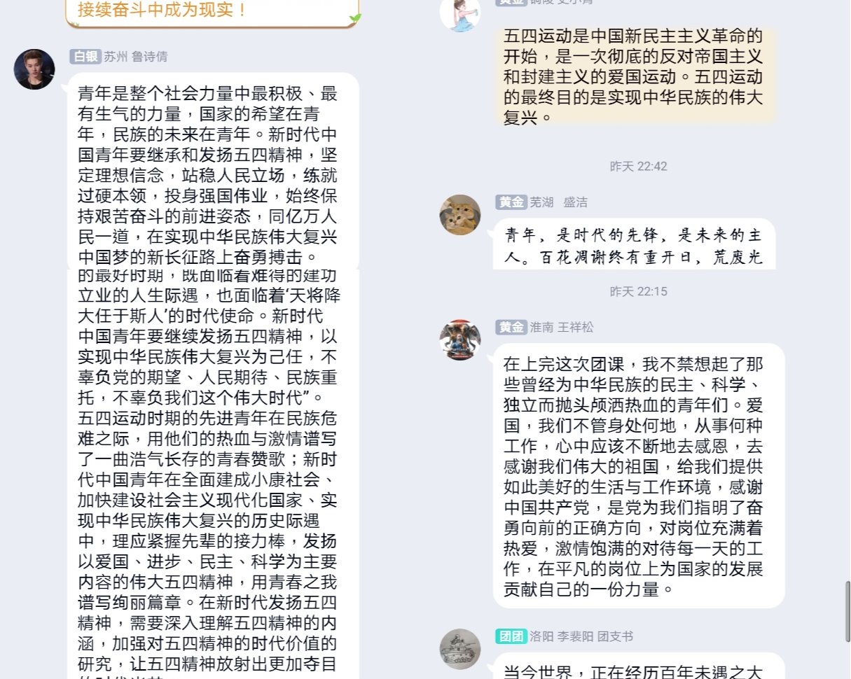 本次主题班会之后,班级同学们积极在线上发表学习心得感悟,做到线上线下相结合,大家纷纷表示将以积极昂扬的姿态传承五四精神,争做新时代新青年。