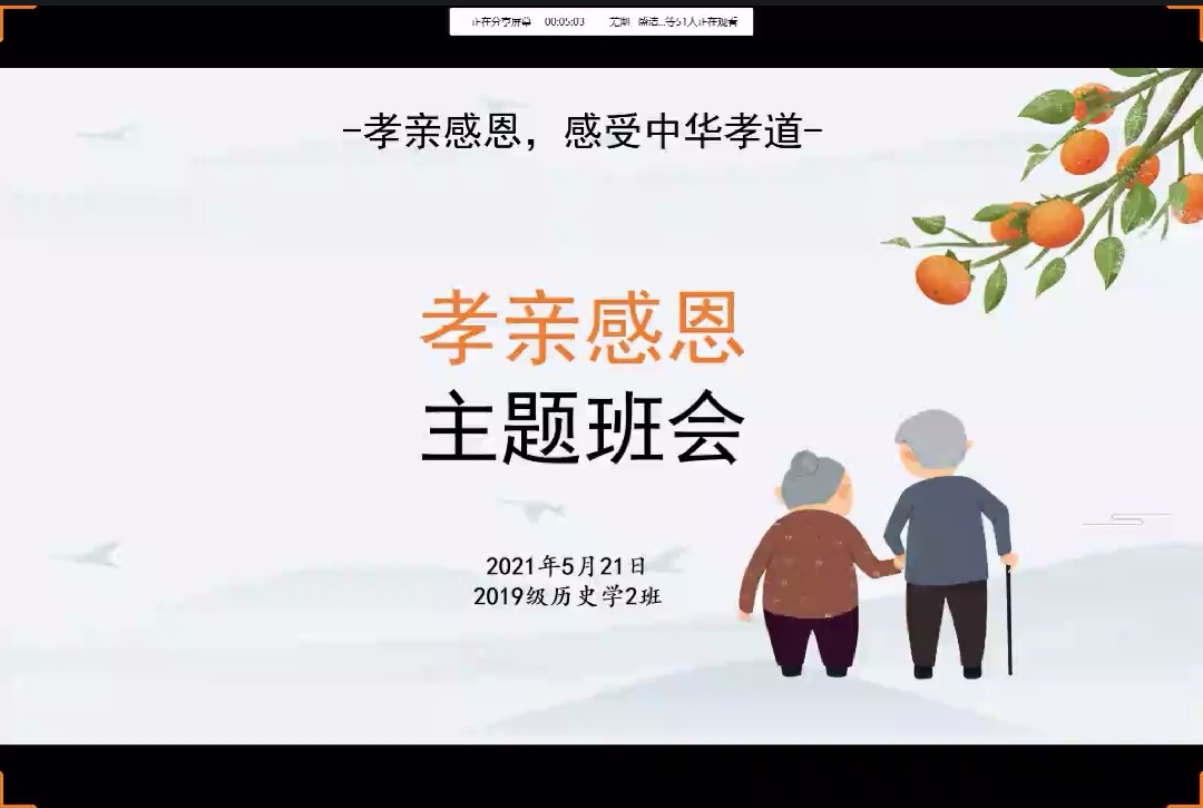 本网讯 (19历史2班 叶宁宁)天地之性,人为贵,人之行,莫大与孝。为响应公司号召,传承中华民族优秀传统文化,弘扬中华孝道,5月21日晚,在辅导员周玲燕老师指导下,2019级历史学2班于线上开展“孝亲感恩,感受中华孝道”主题班会,宣传委员叶宁宁主持本次班会,班级全体同学线上参与。