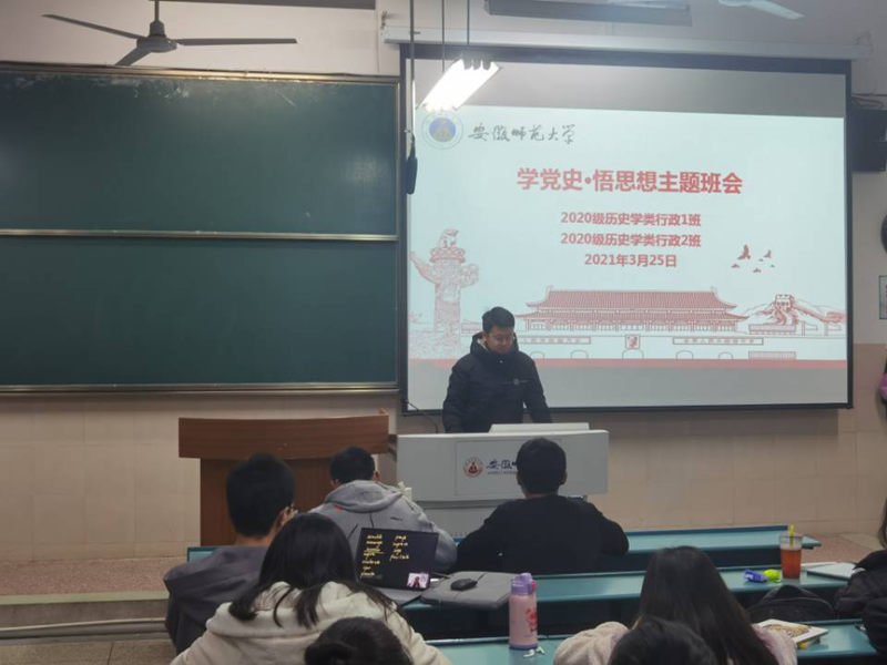 本网讯 (宣传委员 倪子菲)为庆祝中国共产党成立100周年,进一步激发同学们对党和祖国的情感,引导同学们了解党、热爱党、拥护党,2020级历史学类4个班在3月25日晚召开“学党史·悟思想”主题班会,班会由辅导员郭忠尧主持。