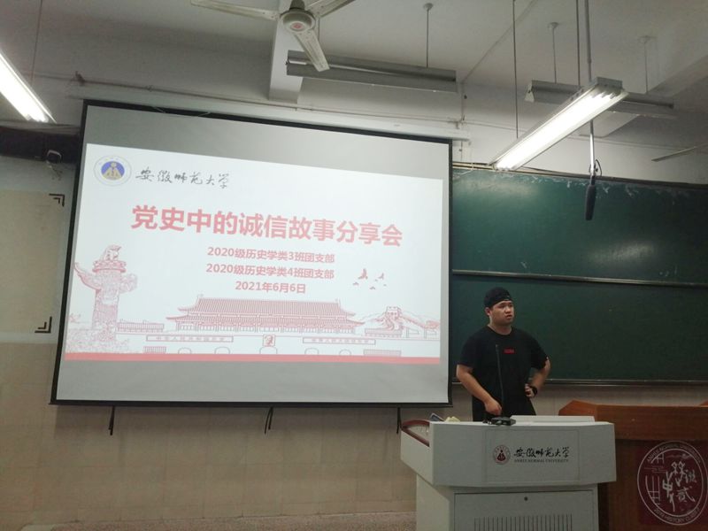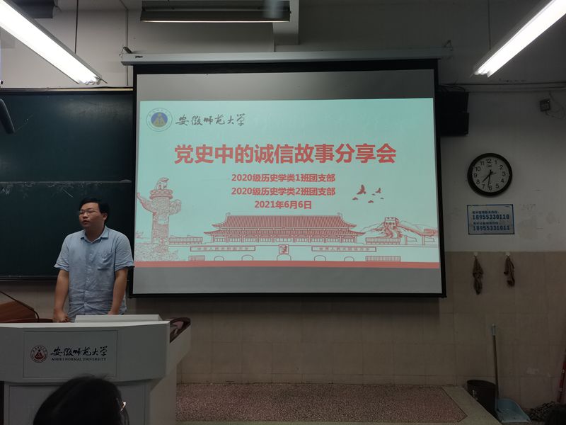 本网讯 (宣传委员 倪子菲)为深入开展党史学习教育,号召同学们诚信做人、诚信做事,2020级历史学类4个班在6月6日晚于2050101、2050102教室召开了党史中的诚信故事分享会。分享会分别由1班团支书许刘栋、3班团支书徐永强主持。