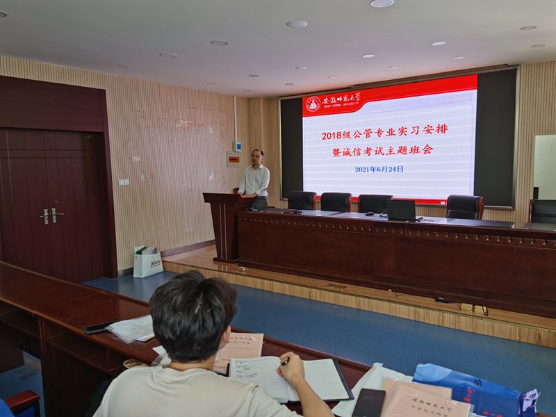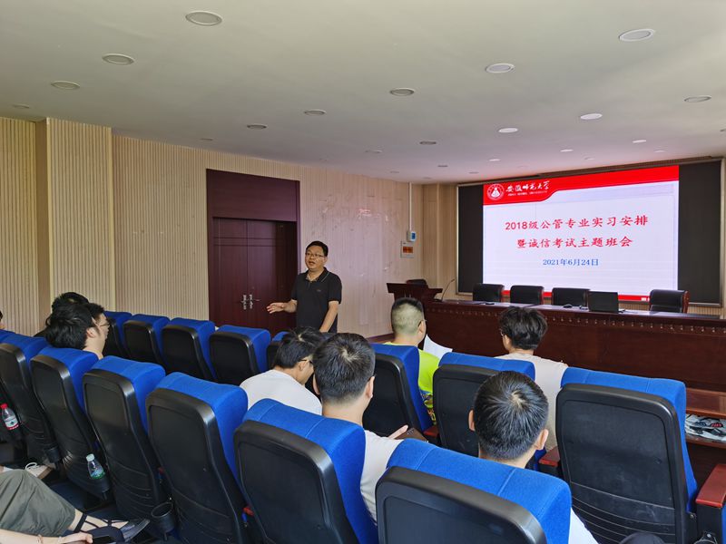 本网讯(18公管 滕空)大三学期将尽,为进一步端正考风、严肃考纪,督促同学们做好实习和考研准备,6月24日上午,2018级公共事业管理专业在公司二楼召开了专业实习安排暨诚信考试主题班会。会议由辅导员宫超主持,18公管全体同学参加。