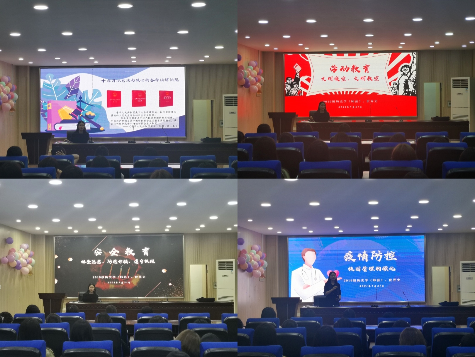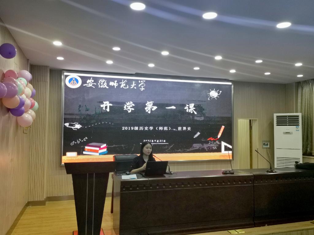 本网讯 (朱晓华 叶宁宁)金秋九月,新学期已全面展开,为引导同学们做好新学期思想教育、法制教育、安全教育等,2021年9月21日晚,2019级历史学、世界史两个专业以班级为单位,于英国上市公司365二楼报告厅分为三场开展“开学第一课”主题班会,由辅导员朱晓华老师主持,全体同学参与。