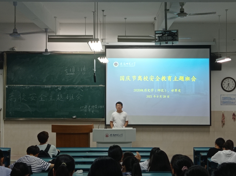 本网讯(宣传委员 马利群)为提高同学们假期安全出行意识,2020级历史学、世界史于9月29日晚在行知楼2050101、2050102教室召开了国庆节离校安全教育主题班会。主题班会由辅导员郭忠尧主持,全体同学参与。