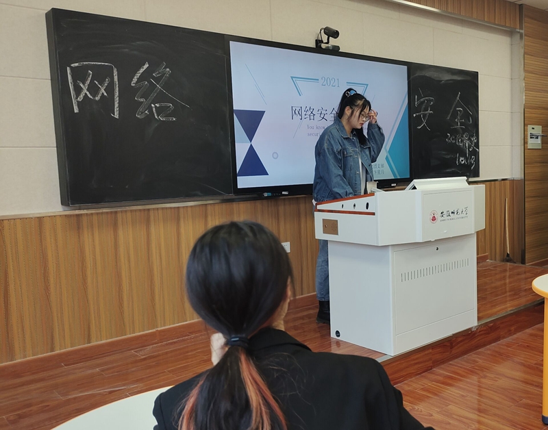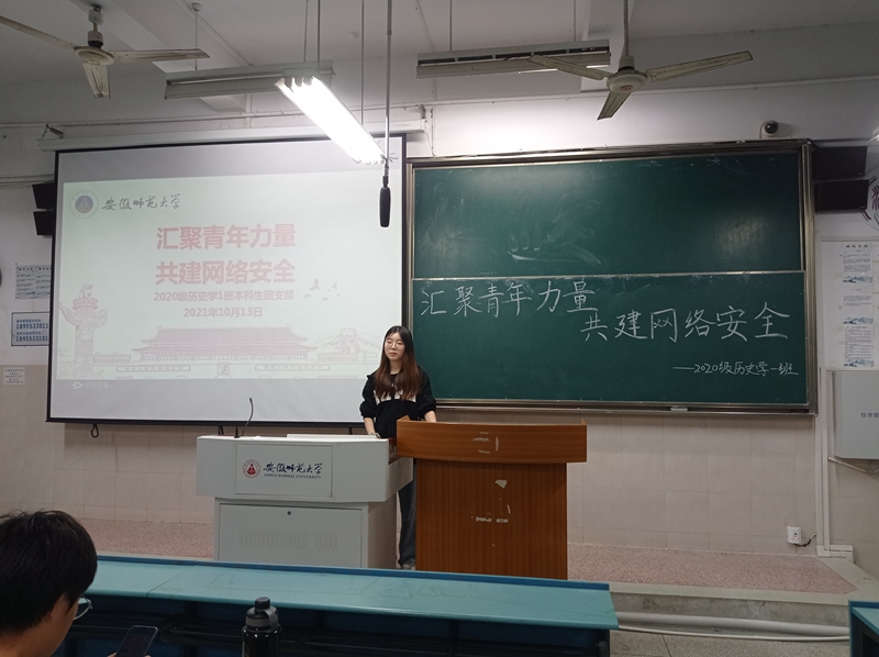 历史学二班团支部书记徐永强围绕“学习网络安全知识,培养网络安全意识”为题开展活动。通过一则视频带领同学们学习了网络安全的内涵、国家相关制度与法律建设的历程,宣讲了威胁网络安全的隐患以及防范网络诈骗的途径等知识,用自己的亲身经历警示同学们提高防范意识,将网络安全知识牢记心中。