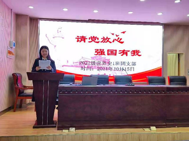 本网讯(2021世界史 池佳航)为培养共青团员爱国情怀、坚定跟党走信念、激发实现民族复兴信心,10月15日下午,2021级世界史在公司二楼报告厅开展“请党放心,强国有我”主题团日活动。主题团日动由班级团支书朱文娟主持,2021级世界史全体同学参加。