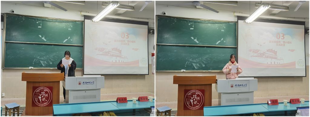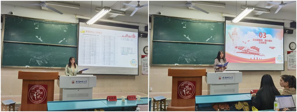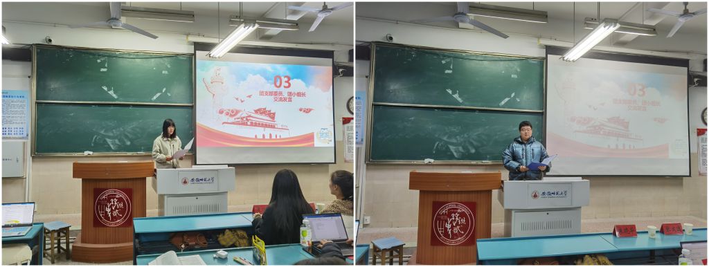 会议第二项,团支书马轻灵同学发言总结汇报了近期党政活动,无论是青年大学习还是主题团日活动,3班均在团支部带领下积极完成,工作效率高。各团小组长依次上台发言,总结汇报近期团小组内团活动情况。团支书马轻灵宣讲了优秀团员的名单并鼓励团员同学们积极进取。