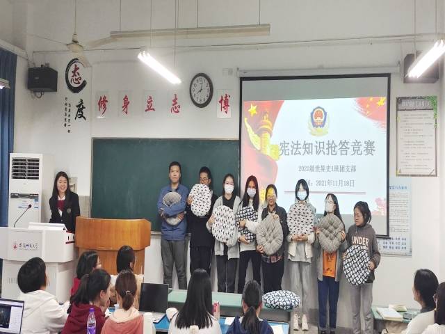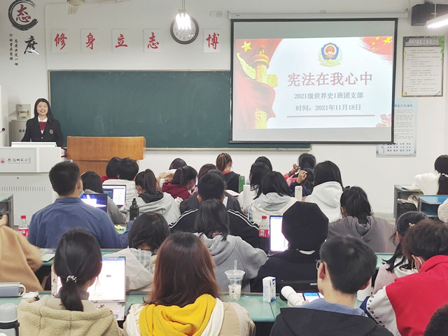 本网讯(2021级世界史池佳航)为普及宪法知识,推进宪法走进生活,2021级世界史专业于2021年11月18日晚在教学楼2070209开展“宪法在我心中”团日活动,21级世界史专业全体同学参加本次活动,本次活动由团支部书记朱文娟主持。