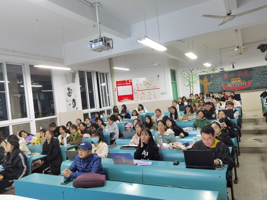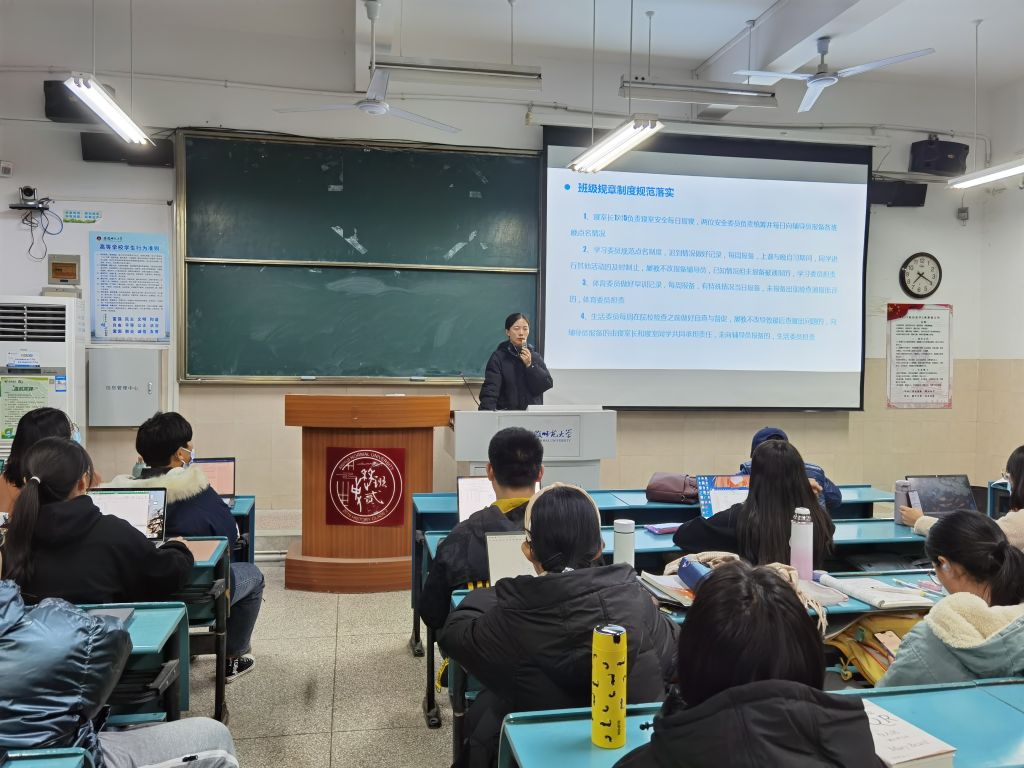 辅导员张文逸在班会的开始就提到“师德规范”、“学科素养”等师范生毕业要求,告诫同学们时刻不忘以此来规范自己的行为。随后,她提到校纪校规中的“四项禁令”并指出班级管理中各方面现存的问题,如上课迟到玩手机、早训迟到不到懈怠以及领操员不认真,及宿舍卫生和安全隐患,晚自习纪律等多方面问题。接着,她提醒班委工作要注意服务同学与班级建设,同时也对未来班级的管理提出了新的要求。
