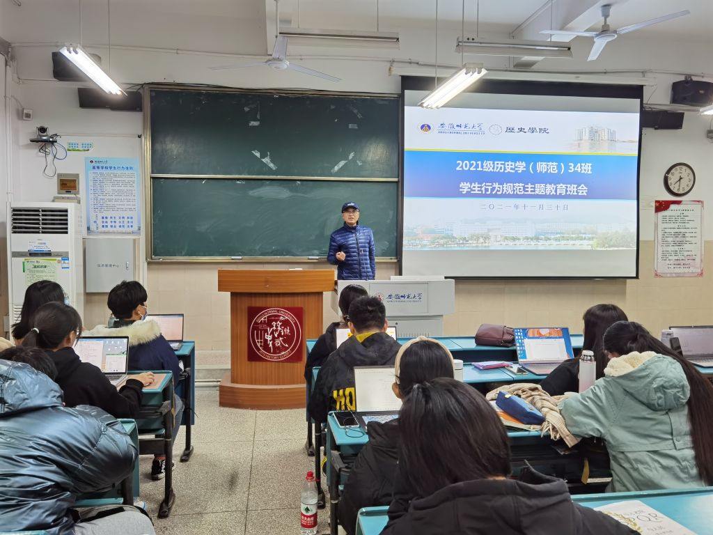 本网讯(21级历史学34班 陆欣雅、吴慧)大学是为国家培养人才的场所,是建设社会主义精神文明的阵地,应当是全社会讲文明、守纪律的楷模。老员工行为的规范不仅有助于促进良好风气的形成,而且有利于青年员工的优良品德的培养。为切实增强员工的安全防范和纪律规范意识,保障员工安全,2021级历史学(师范)34班于2021年11月30日在2040102教室举行了老员工行为规范安全教育主题班会,本次会议由辅导员张文逸老师主持,公司副处级辅导员、员工工作负责人宫超老师为出席嘉宾,2021级历史学(师范)34班同学参与。
