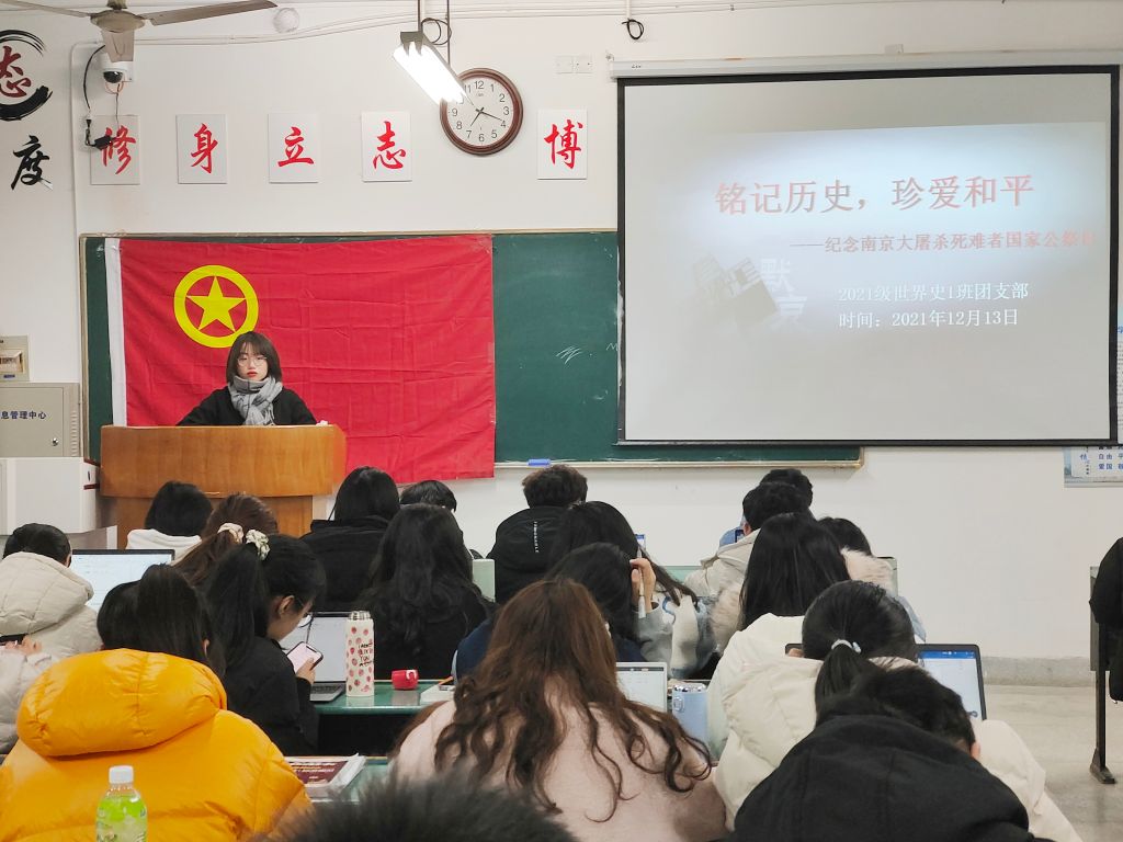 为响应国家号召,铭记历史,捍卫和平,引导青年团员以史为鉴,勿忘国耻,增进爱国情怀和民族使命感,2021级世界史专业于2021年12月13日晚在教学楼2070209开展“回望历史,警钟长鸣——纪念南京大屠杀死难者国家公祭日”主题团日活动。本次活动由副班长李雅涓主持。