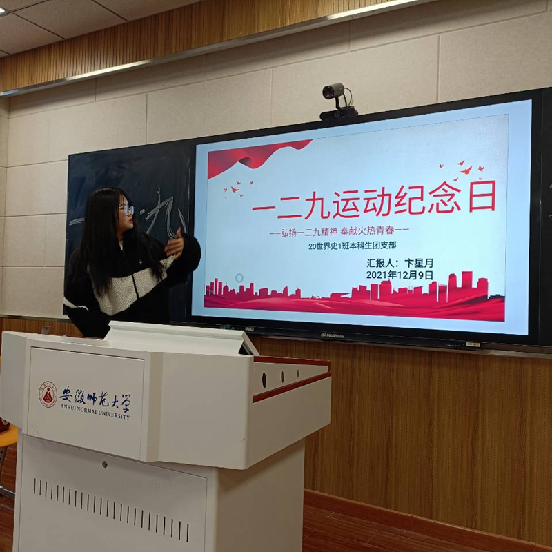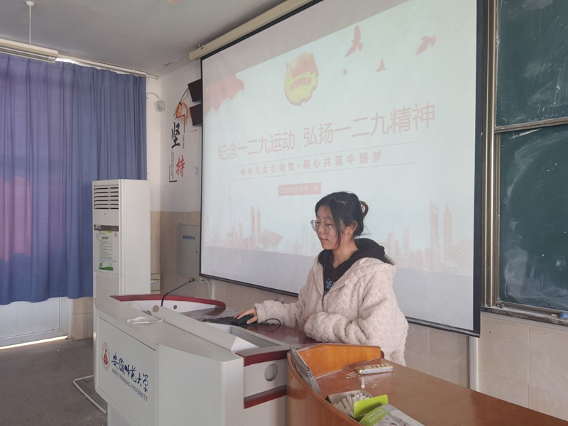 历史学2班团支书徐永强详细介绍了“一二·九”运动的背景、经过和影响,为加深同学们对于“一二·九”运动的认识,徐永强通过大量纪实照片以及相关文字资料向同学们展示了“一二·九”运动的时代印记。徐永强特别号召同学们进一步坚定理想信念,以实际行动积极向党组织靠拢。