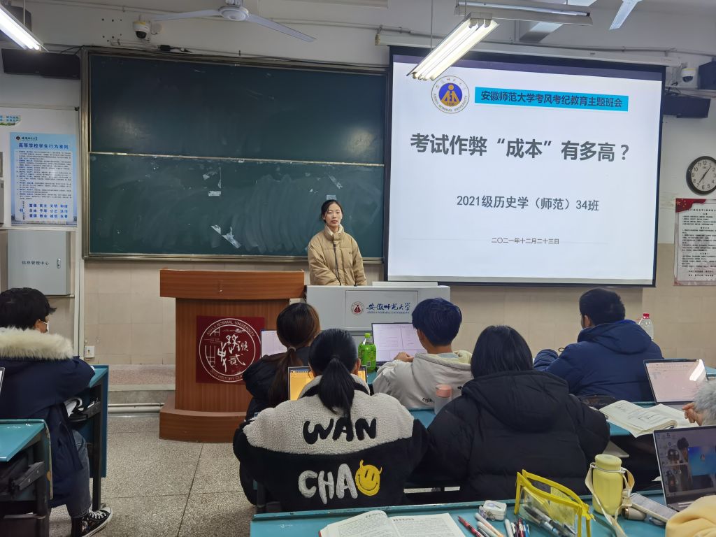 本网讯(21级历史学3、4班 陆欣雅、吴慧)为了迎接即将到来的考试周,树立良好的考风考纪,21级历史学3、4班在12月23日晚上七点于2040102教室召开考风考纪教育主题班会。辅导员张文逸主持了本次班会,3、4班全体同学参与。