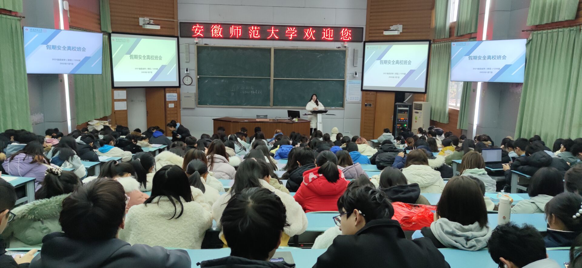 会上,韩雪老师重点强调了各方面安全问题。一要注意离校安全。离开宿舍时要保证寝室关门关窗、关闭电闸水闸、贴上封条;二是注意居家安全。严格落实疫情防控要求,及时接种加强针,学习基本安全急救知识;三需注意假期安全。疫情当下,同学们要避免前往中高风险地区,留校同学也需要注意安全排查。