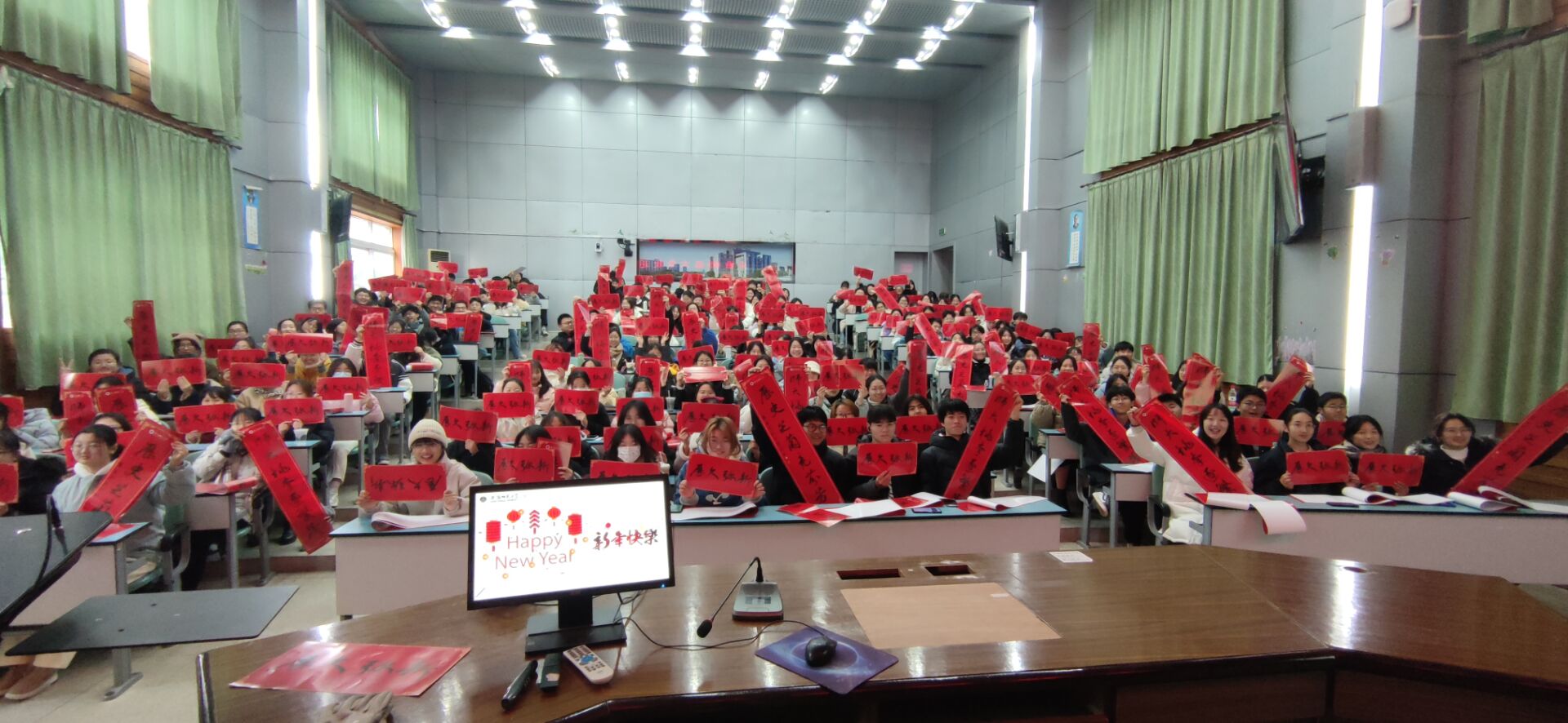 最后,韩雪老师还给所有同学们分发了由安徽省高等公司书法协会首任主席庄华峰教授书写的对联,大家举起对联合影留念,共同期盼即将到来的新春佳节。寒冬期末,共迎佳节。在踏上返乡归途之前,也要牢固安全意识,为自己老员工涯的第一个学期画上完美的句号。