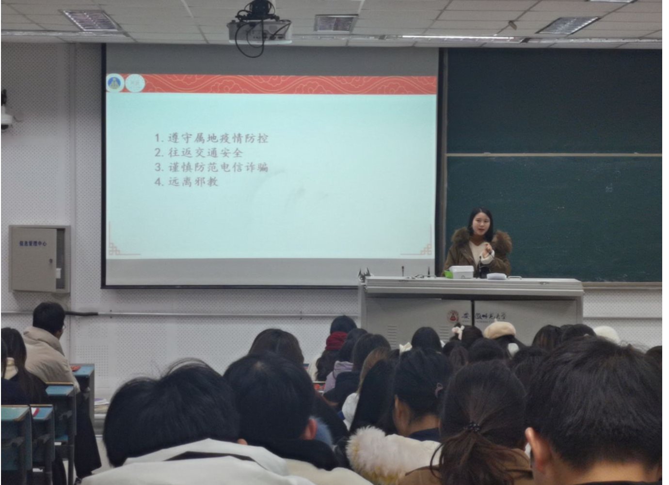 班会伊始,朱晓华老师向同学们传达了安全、文明离校的注意事项,如保持宿舍卫生及做好断水断电,做好自身防护,有序文明出校。老师也督促大家做好离校报备,在回家路途中注意自己的人身、财产安全,注重防疫工作,回家后遵守属地疫情防控要求,保护好自己。接下来,老师也提醒同学们假期持续提高警惕,谨防诈骗,反对邪教,文明上网。