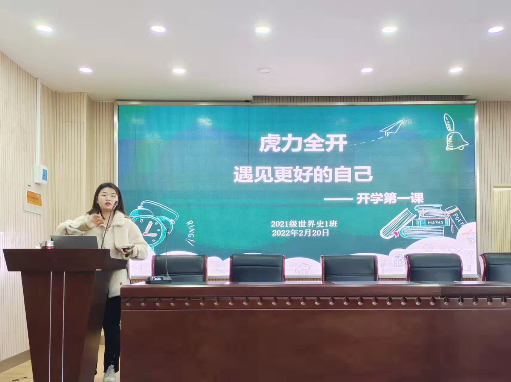 本网讯(胡昊宇 池佳航)为加强思想政治教育,指导员工新学期学业规划,安排开学后相关事宜,2021级世界史专业于2021年2月20日下午在公司二楼报告厅开展“虎力全开 遇见更好的自己”——开学第一课主题教育班会,本次班会由辅导员朱慧主持。