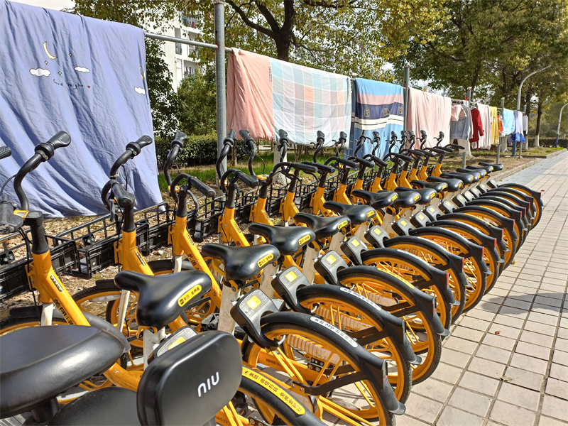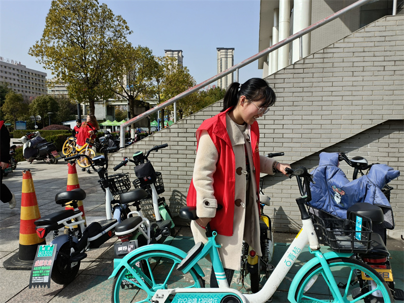 志愿者们沿着校园道路,从南边食堂到北边小食代,认真投入志愿服务工作中。此次志愿者们的工作主要是将共享单车进行整理,并将其统一停放在校园里的规定区域。停车不规范问题早已成为共享单车服务单位的积弊,威胁着员工们的安全,也不利于校园环境的美化。在志愿者们细致而又耐心的工作后,一辆辆共享单车被整齐的摆放在规定区域,蓝、绿、黄三色为校园画出一道道亮丽的风景线。