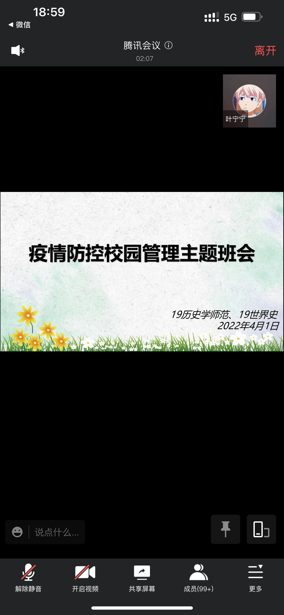 (本网讯/19历史1班刘燕杰)为了加强对同学们的管理和思想教育,使同学们能更加自律,遵守公司的规定,协调好学习与生活,辅导员朱晓华老师4月1日晚七点主持了关于“疫情防控校园管理”主题的线上班会,历史学、世界史全体同学参加。