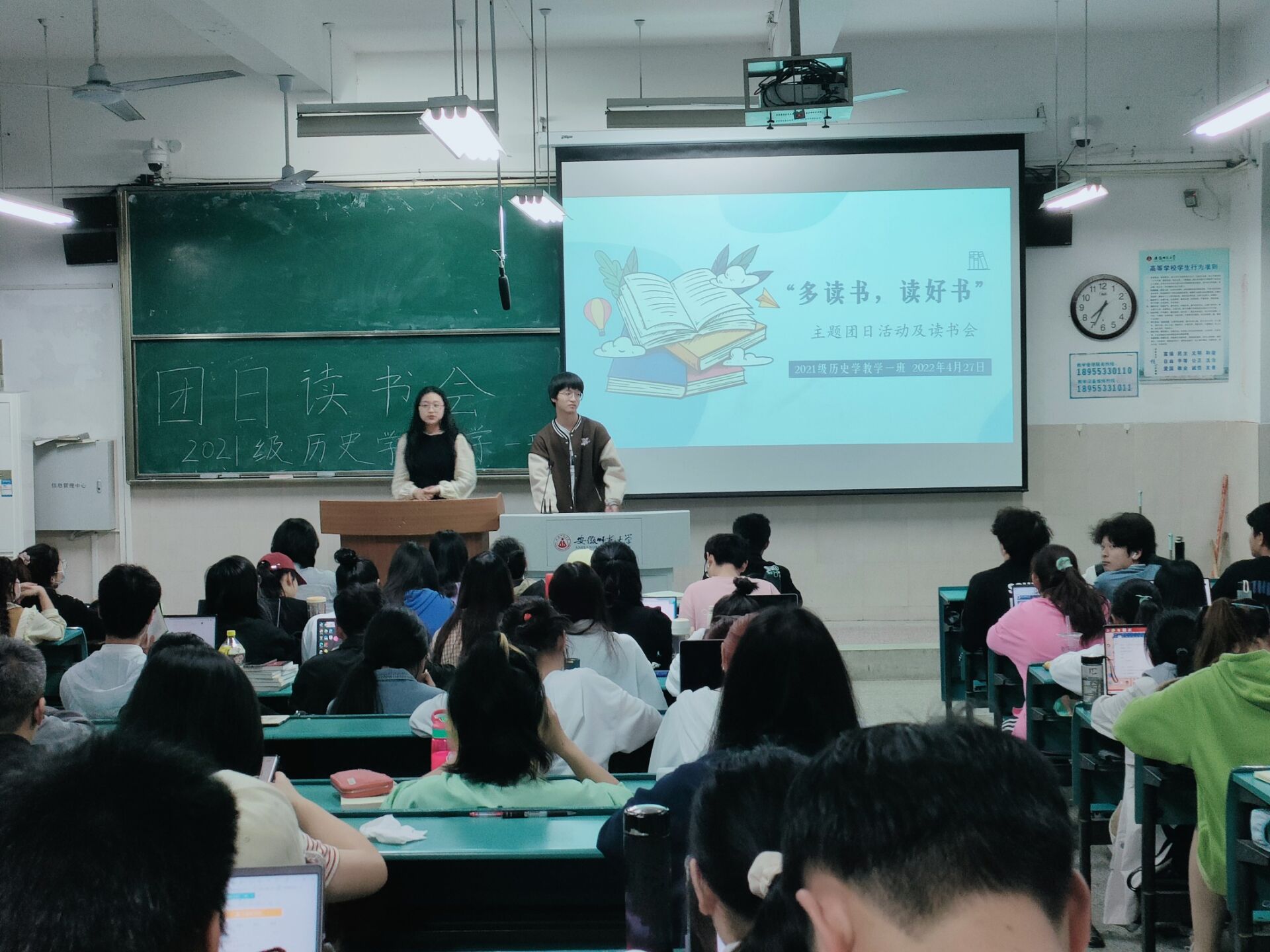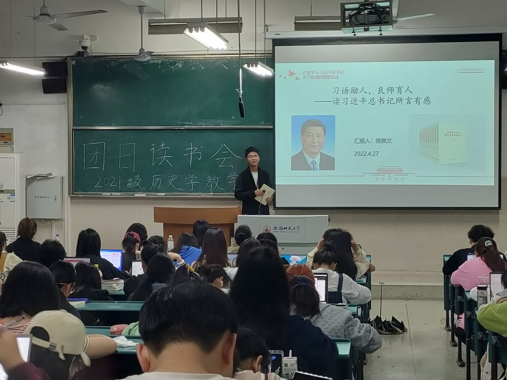 本网讯(21历史 崔雯)为了响应全民读书的号召和学习习近平总书记关于教育的重要论述,2021级历史学(师范)教学一班全体同学于4月27日在2050101教室开展了团日读书会。