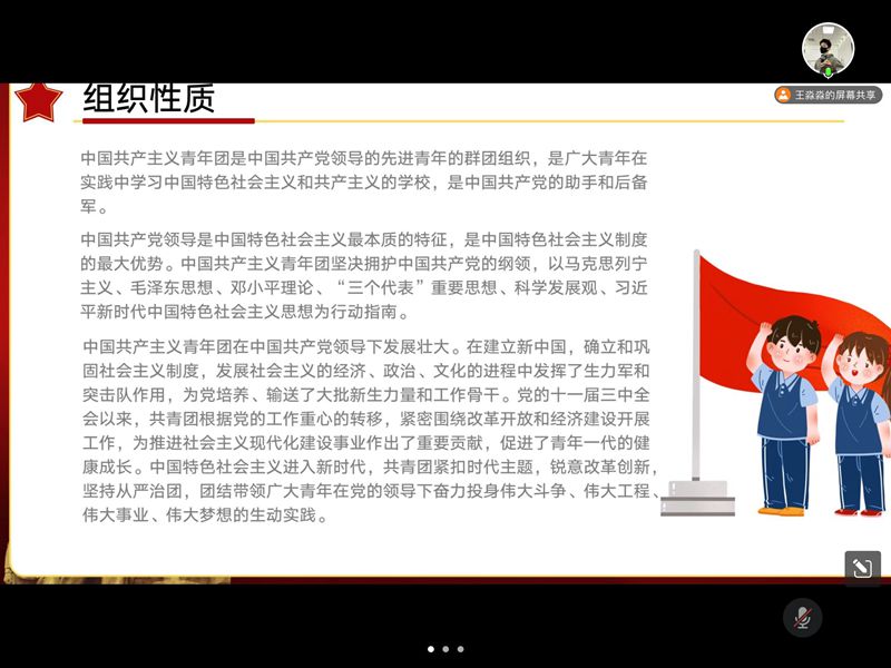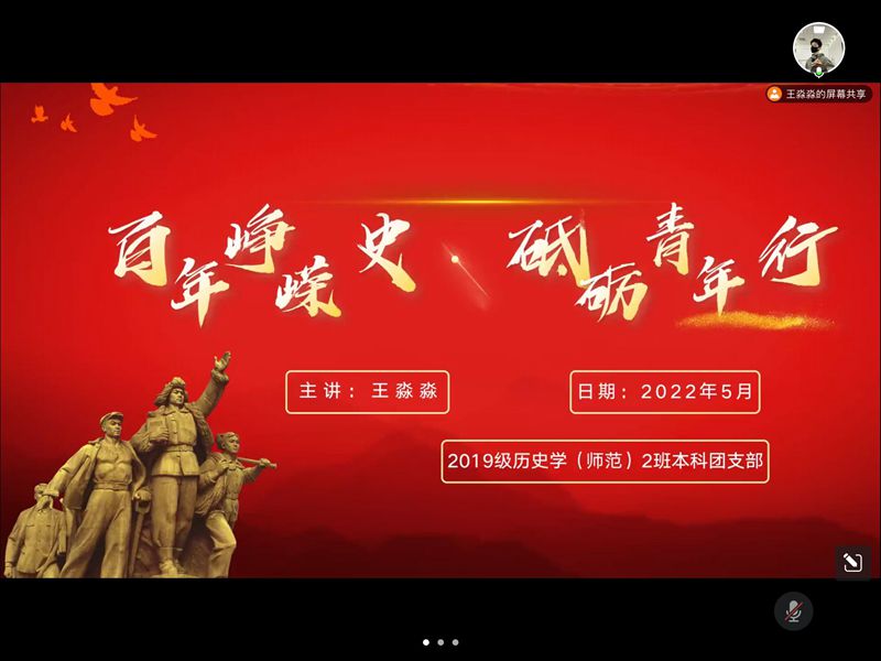 本网讯(19历史叶宁宁)为庆祝中国共产主义青年团成立100周年,传承五四精神,凝聚青春力量,团结引领班级团员青年坚定“四个自信”,增强历史自觉,永远跟党走,奋进新征程,2019级历史学2班于5月4日晚19:00召开了一次线上主题团日活动,班级全体同学线上参与。
