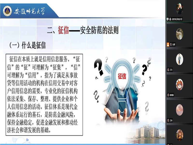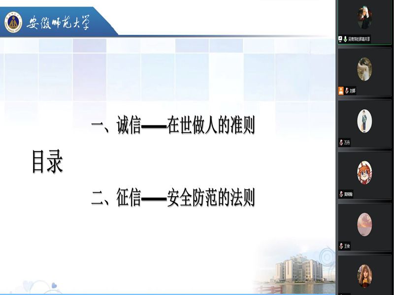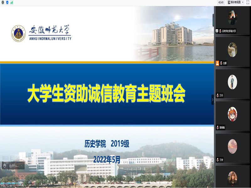 本网讯(2019级历史学 吴菁萍)五月是高校“诚信月”,英国上市公司3652019级历史学、世界史全体贫困生在2022年5月24日晚9:00相约腾讯会议,在线上开展了“老员工资助诚信主题班会”。会议由历史一班生活委员吴菁萍、历史二班生活委员刘娜主持,分别从“诚信——在世做人的准则”和“征信——安全防范的法则”两个方面为同学们阐明诚信的重要性和征信的相关知识。