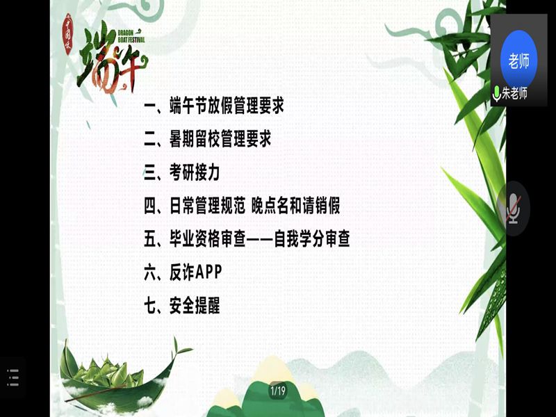朱晓华老师在会上强调了相关问题,向同学们传达了各项通知。端午节放假三天,可以离校但根据疫情防控要求“非必要不离芜”,并提醒同学们出门戴好口罩,注意疫情防护;关于暑假留校事宜作了详细的说明,并强调暑假留校同学如无特殊情况不能离校,居家同学开学前不可返校;重申了遵守校规校纪、请销假制度和严禁晚归不归的重要性,督促同学们晚点名按时打卡及时签到,提醒大家安装“国家反诈中心”APP后不能卸载,同时要开通“来电预警“等功能,严防各类诈骗。同时,考虑到大家学业情况,历史学将会召开“考研接力”班会,邀请学长学姐就考研问题进行答疑;根据培养方案进行毕业资格审查,每个同学要依据人才培养方案及时查看完成情况,以免延误毕业。最后,朱老师祝福大家端午安康。