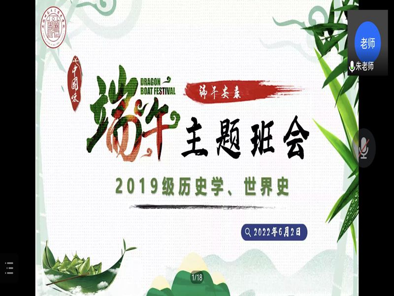 本网讯(19历史师范1班刘燕杰)端午佳节将至,为了让同学们了解假期安排以及公司管理要求。6月2日晚上,2019历史学、世界史召开端午节主题班会,由于部分实习生尚未返校,本次班会线上召开,会议由辅导员朱晓华主持,全体同学参会。