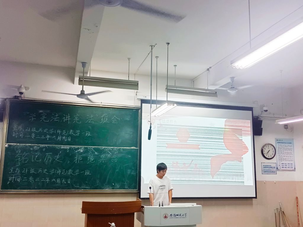 本网讯( 崔雯)为了帮助同学们更好的理解宪法的意义,学习宪法并将其作为前行的指向标,在6月9日晚,21级历史学(师范)教学一班于2050101教室举办了“学宪法,讲宪法”班会。