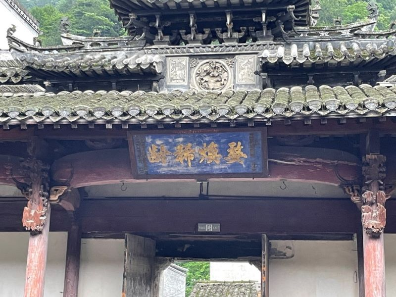 29日上午,团队抵达叶村,寻找洪氏祠堂遗迹。洪氏祠堂原建明初,改建于明末,集古徽州砖雕、木雕、石雕艺术于一身,具有较高的艺术价值。团队在三阳镇政府张志主任的带领下以及村干部赵咏芳主任的讲解下,先后造访叶村的洪氏支祠和洪氏宗祠。宗祠敬本堂里悬挂着洪道远为其母所作的“婺焕稀龄”的金字寿匾,女性的寿匾出现在祠堂里十分罕见,这体现了叶村洪氏注重孝道的家族传统。
