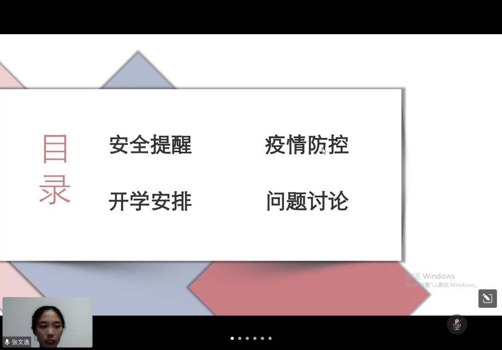 接着,她对新学期的学习与生活作出简单的规划预警,督促同学个人做好大二学年学习规划,督促班委做好班级学习计划,包括师范生讲课与板书技能规划等。新学期女生宿舍安排公示,得到了同学们的一致认可。同时,她还提醒同学们,在疫情防控持续抓紧的情况下,要注意做好疫情防护,按时今日校园打卡、进行核酸检测。班会的最后,张老师解答了同学们关于返校相关工作等问题。