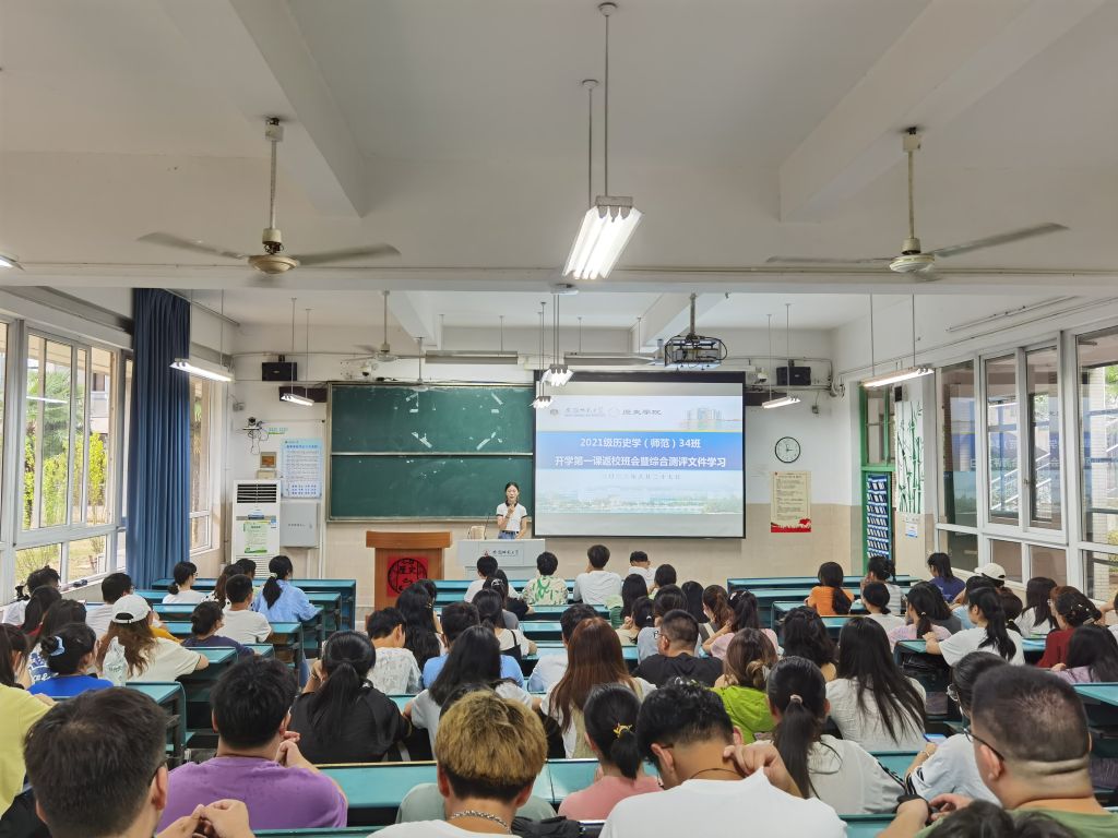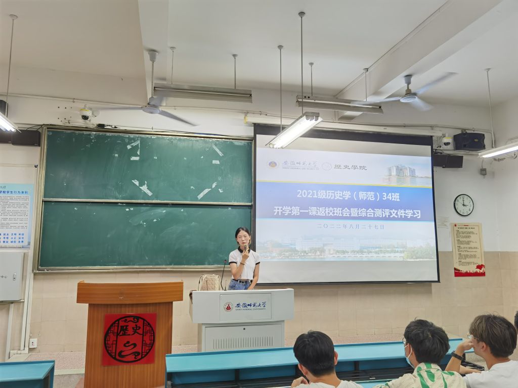 (本网讯 21级历史学 陆欣雅、吴慧)新学期新气象,为了进一步推进老员工学习和安全教育、严格落实疫情防控工作,对新学期工作进行布置安排,2021级历史学(师范)3、4班于2022年8月27日下午在2040102教室召开“开学第一课”员工返校班会暨综合测评文件学习班会,班会由辅导员张文逸老师召开,21级历史学3、4班全体同学参与。