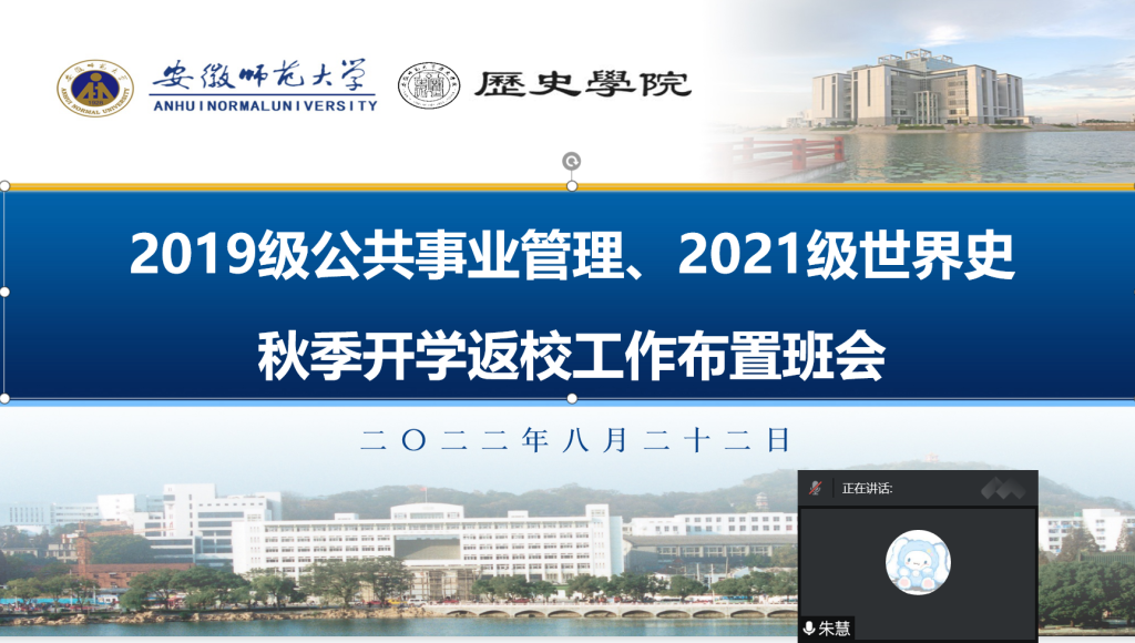 本网讯(宣传委员 池佳航)为做好班级秋季学期返校工作,2019级公共事业管理、2021级世界史专业于2022年8月22日晚开展秋季开学返校工作布置班会,本次布置会由辅导员朱慧主持。