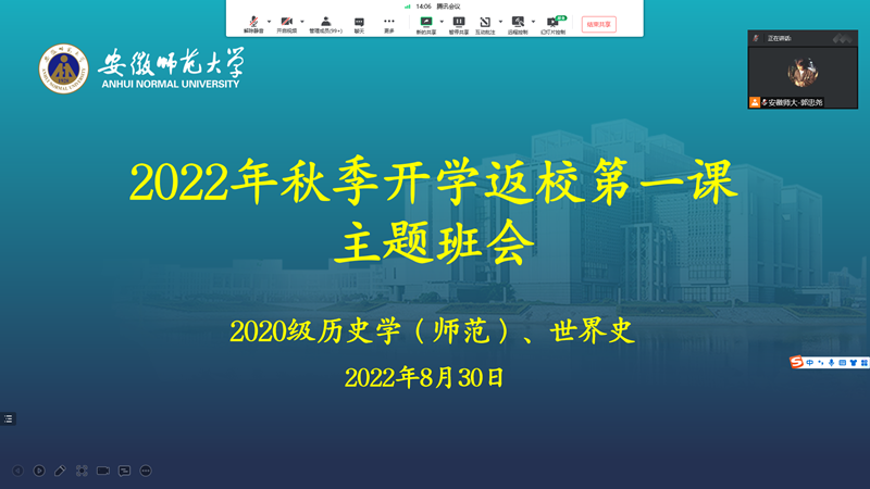 本网讯(宣传委员 马利群)8月30日13时30分,2020级历史学、世界史专业通过腾讯会议召开了2022年秋季开学返校第一课主题班会,班会由辅导员郭忠尧主持,全体同学参与。