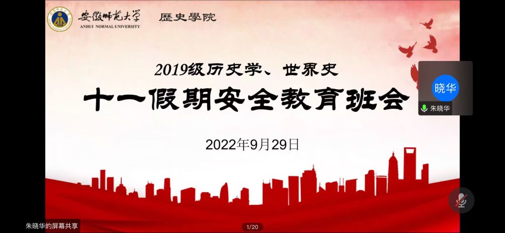 本网讯(19历史师范1班 刘燕杰)国庆假期临近,为提高员工的安全意识,确保回家和留校员工的人身安全,让广大同学度过一个欢乐祥和的假期,9月29日中午,2019级历史学、世界史召开安全教育班会,辅导员朱晓华老师主持,全体同学参会。