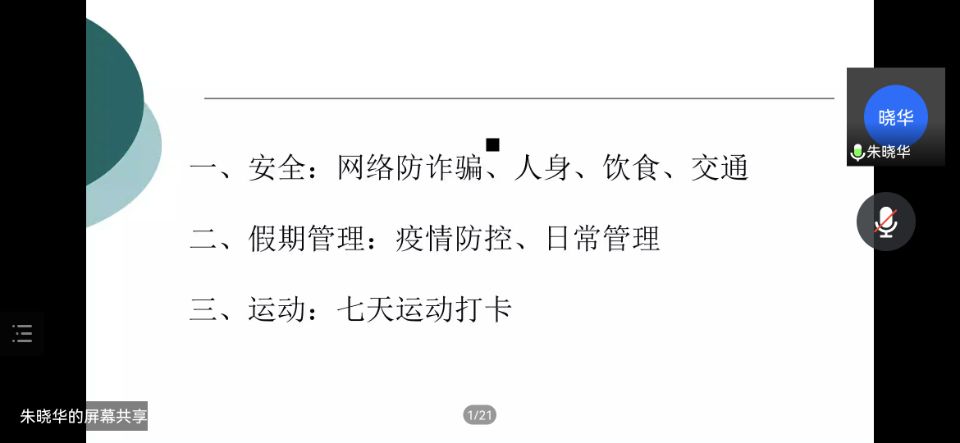 会议以安全为主题,包括假期安全、假期自我管理、七天运动打卡活动等三个方面。会上,朱老师向与会同学重申了增强自身安全意识和保护措施的重要性,让大家务必不忘预防网络诈骗,文明理性上网,假期外出注意饮食和交通安全,切实防范,保护自我。