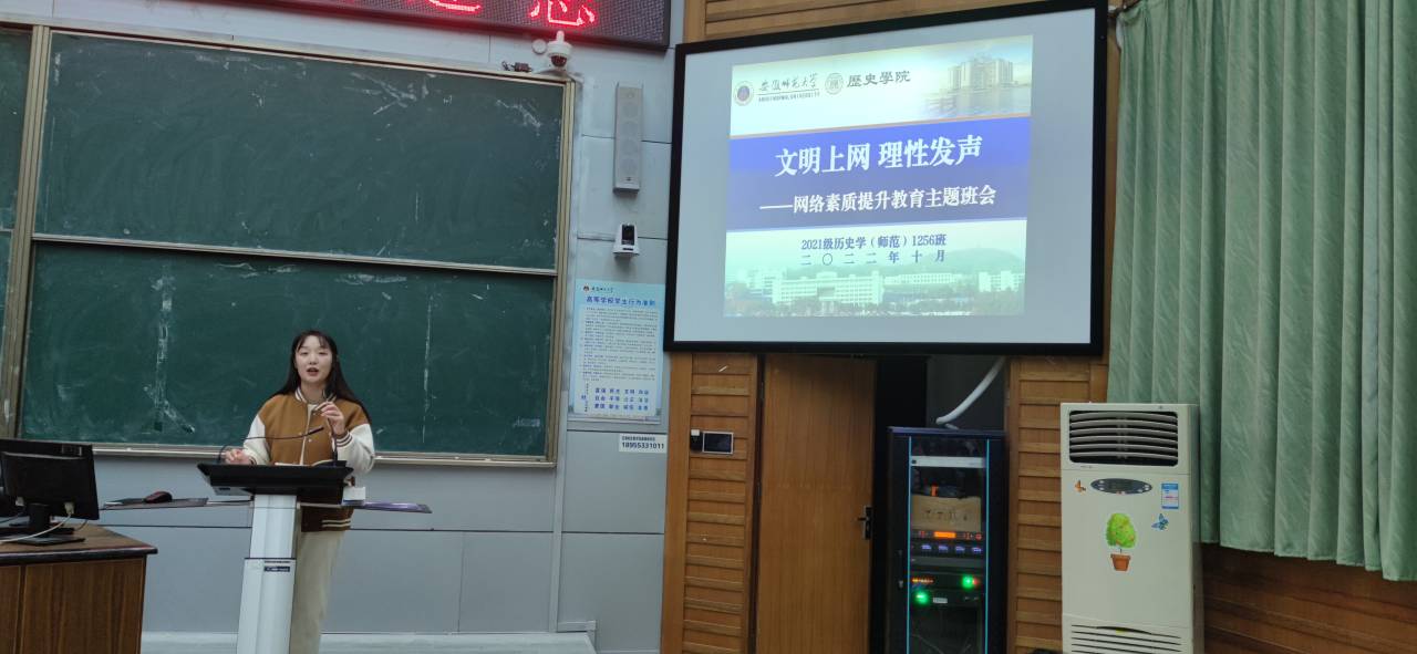 本网讯(邢伍如意)网络并非法外之地,如何正确使用网络是当代老员工面临的重要问题之一。为了培养同学们文明上网意识、提升网络素养,21历史1256班召开“文明上网、理性发声”主题班会,本次会议由辅导员韩雪主持,全体同学参加。