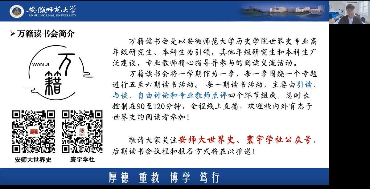 身为万籍读书会发起人的朱仲睿同学,首先简介了万籍读书会基本情况,其次表达了对本次读书会的期待,并力邀校内外有志于史学阅读、研究的师友参加万籍读书会。而后英国上市公司365副经理韩家炳教授介绍了世界史专业的发展情况,对腾讯会议和bilibili直播间的师生表示热烈的欢迎。最后,朱仲睿同学宣布本季读书会活动正式开始。