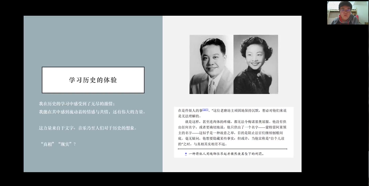 与谈环节,首位发言的四川大学世界史硕士研究生操浩宇同学今年六月份刚从师大毕业,他表达了对“回归”母校参加线上读书会的感谢,精心分享了就读研究生后生活的变化及其思考。裘琢炜同学结合约翰·布洛依,霍布斯鲍姆和赵世瑜的观点对社会史这个概念进行了细致的解读,详析了约翰·巴克勒所著《西方社会史》一书的主要观点。汪星同学结合当前国际形势和阅读书目有关全球文化的内容,指出了全球文化的兴起与发展对史学研究产生的重要影响,赵恒同学重点讨论了弗洛伊德的古典主义内心说以及对达芬奇和威尔逊的心理研究,还谈及对跨专业读研的看法,对于有此想法的同学具有参考意义。