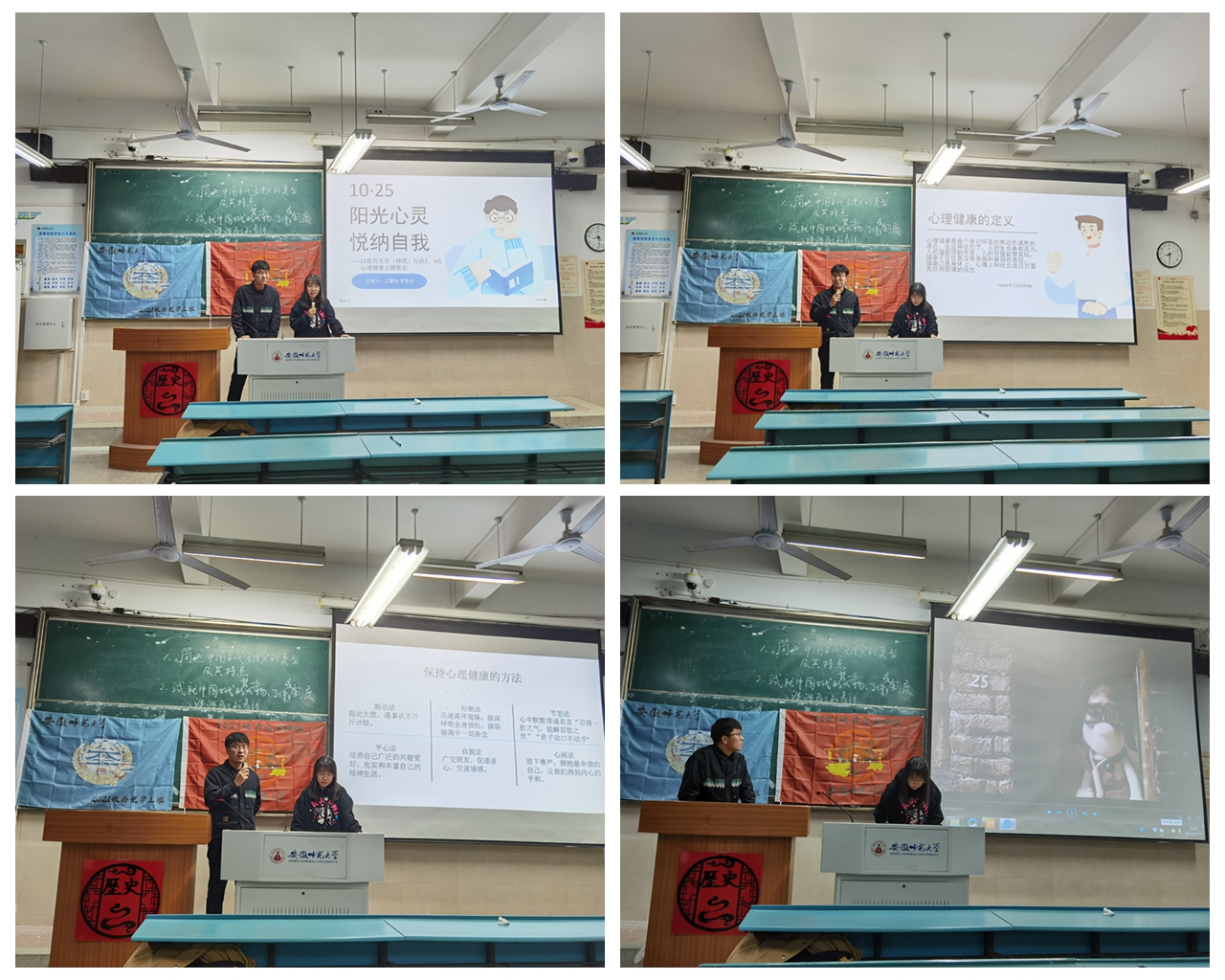 班会伊始,两位心理委员首先向同学们解释了本次心理健康主题班会是为了在大二学业压力骤增的情况下帮助大家依旧能保持一个良好的心态。他们先后介绍了心理健康的定义、心理健康的判定方式以及心理的自我调整方式。详细生动的解说让同学们对如何判定心理健康、保持心理健康的方法以及如何从公司内的心理健康教育中心寻求帮助有所了解。接着,两个班同学纷纷上台分享自己从大一到大二的心路历程转变,并跟随心理委员一起完成了一个肢体微动作的心理小测试。随后,班级同学踊跃参与到心理健康知识问答中,并通过知识问答丰富了对心理健康的认识。最后,全体同学一起观看了治愈影片《玛丽和马克思》,舒缓了近期的学业压力。