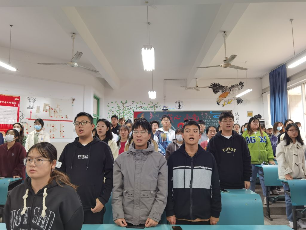 会议开始,全体师生起立奏唱国歌。接着,两位团支书从过去5年工作和新时代10年伟大变革的重大意义、习近平新时代中国特色社会主义思想的世界观和方法论、中国式现代化推进中华民族伟大复兴的使命任务、伟大自我革命引领伟大社会革命的重要要求和团结奋斗的时代要求这五个方面带领同学们一起学习了党的二十大精神。随后,各个团小组代表上台发言,讲述了自己对二十大报告内容的理解。大家一致认为,在党的二十大的召开背景下,我们青年实现梦想、成就自我的舞台更加宽阔了,更要在党的带领下,积极投身于社会主义建设中,为实现中华民族伟大复兴的中国梦做出自己的贡献。最后,同学们一起参与到心语树洞祝愿二十大的互动中,纷纷写下自己对祖国未来的祝福和期许。