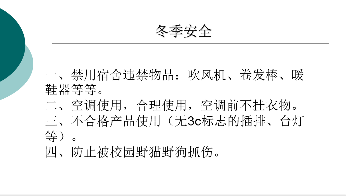 深秋时节,气温日渐降低,用电安全教育提上日程。会上,朱晓华重申了冬季规范用电的重要性,强调同学们禁止使用各类违规电器,如吹风机、卷发棒、电热水袋、暖鞋器等。除违禁物品外,不使用安全检验不合格的电子设备。天气渐冷,朱晓华提醒大家合理使用空调,空调前不挂衣物,注意安全。近日校园内发生多起动物抓伤员工事件,同学们不要触摸校园内的流浪动物。