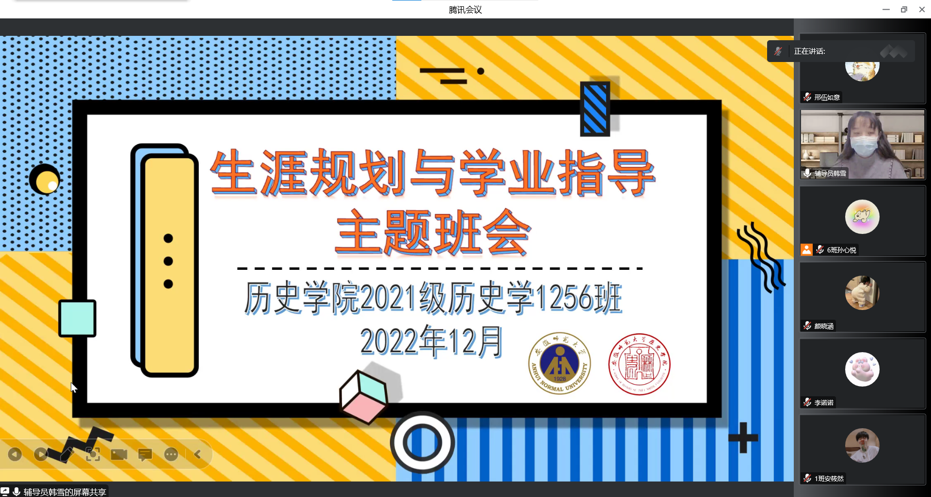 本网讯(图/文 邢伍如意)作为历史学师范专业大二的员工,在肩负学习重担的同时,我们也面临着就业、考研等多方面的压力,只有做到自身功夫硬,才能不惧挑战。为了帮助同学们磨练师范生技能,提升专业素养,辅导员韩雪老师于2022年12月18日晚七点半召开了本次生涯规划与学业指导班会,教学一三班全体同学参加。