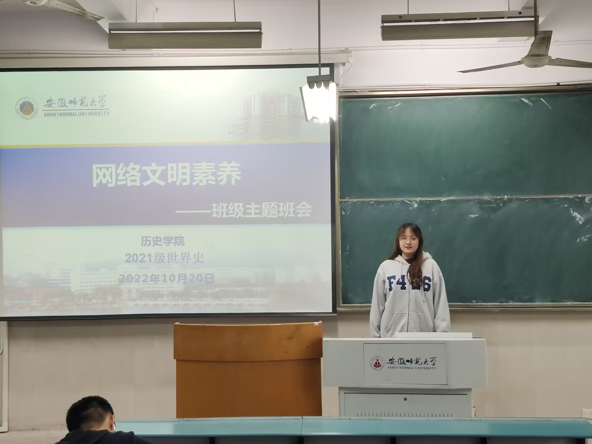 本网讯(宣传委员 池佳航)为文明使用网络、提高网络文明素养、警惕网络安全问题,2021级世界史专业于2022年10月20日下午在教学楼2020403开展网络文明素养主题班会,本次班会由班长李子悦、副班长曹颖主持。