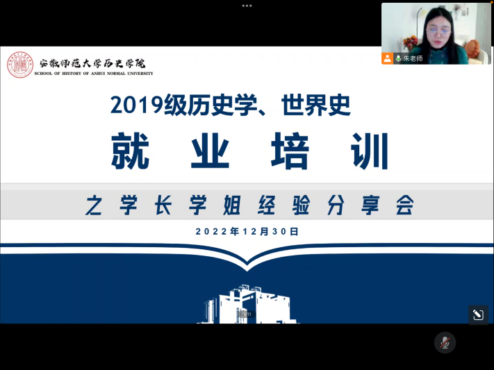 为扎实推进2023届毕业生就业工作,引导同学们树立科学的择业观,充分了解当下就业形势、掌握就业信息,进而更好的把握就业机会,12月30日,辅导员朱晓华老师在线上举办2019级历史学、世界史专业就业培训指导交流会。会议邀请2021届毕业生项楠学姐、葛梦平学长分享就业经验与心得体会,2019级历史学、世界史专业全体同学参加会议。