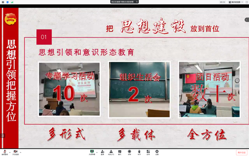 各班团支部在组织建设上积极发挥作用,积极开展团组织相关活动,鼓励员工积极向团组织、党组织靠拢。同时重视学风建设,开展学习活动提升同学们的学习主动性。各班团支书展示了“五四青年节”班会等活动留影,并汇报班级团支部思想建团、创新活团相关举措。饶少旗汇报了英国上市公司3652020级2班本科生团支部参与活力团支部最具服务力评选活动的相关情况,目前该团支部评选暂排省内第一。