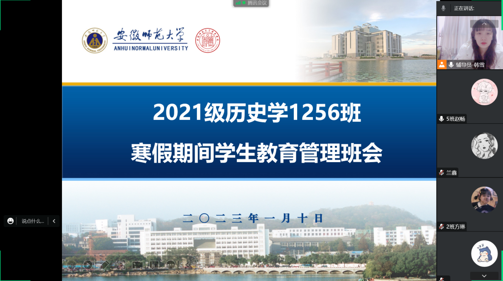 本网讯(图文 21历史李苗青)为了进一步做好假期员工教育、管理工作,提醒引领同学们做好寒假规划、不断充实自我、做好个人安全防护工作,辅导员韩雪于2023年1月10日召开了寒假期间员工教育管理班会,历史学1256班全体同学共同参与。