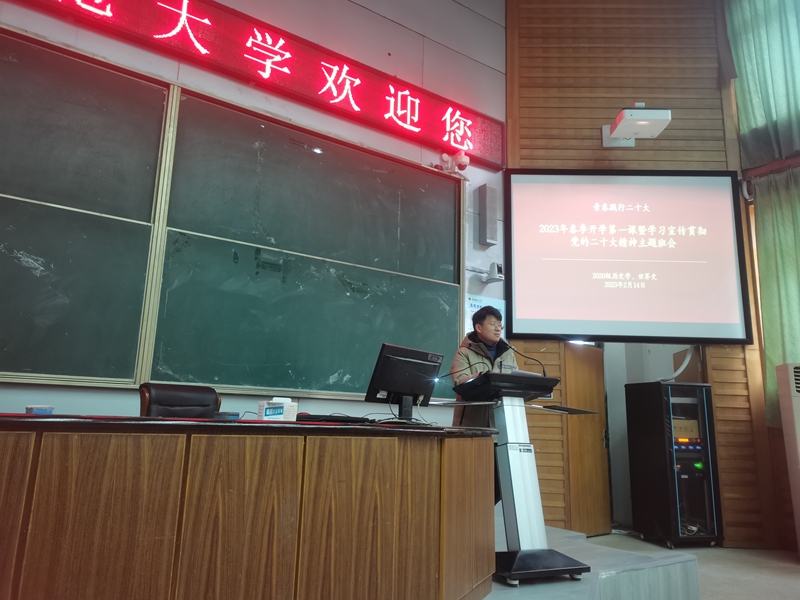 本网讯(文/马利群 图/李静)为深入学习宣传贯彻党的二十大精神,系统推进新学期员工教育、管理、服务工作,配合公司落实“两大振兴行动计划”,2月14日上午,2020级历史学、世界史专业于行知楼2010105教室召开2023年春季开学第一课暨学习宣传贯彻党的二十大精神主题班会,会议由辅导员郭忠尧老师主持,全体同学参与。